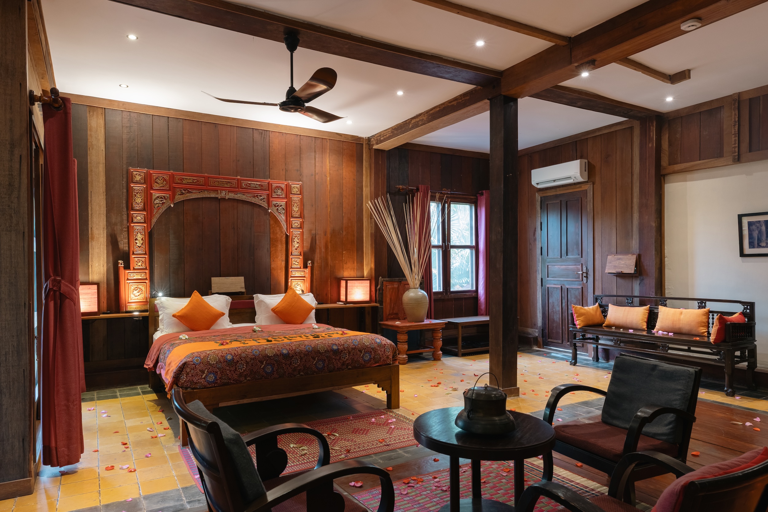 At Maisons Wat Kor, the Grand Lotus Ambassador room offers a rare blend of Khmer elegance, cultural richness, and historical significance. This unique room has hosted global icons, including Angelina Jolie, along with ambassadors from the United States, France, Germany, Japan, Korea, Australia, the United Kingdom, India, and more.